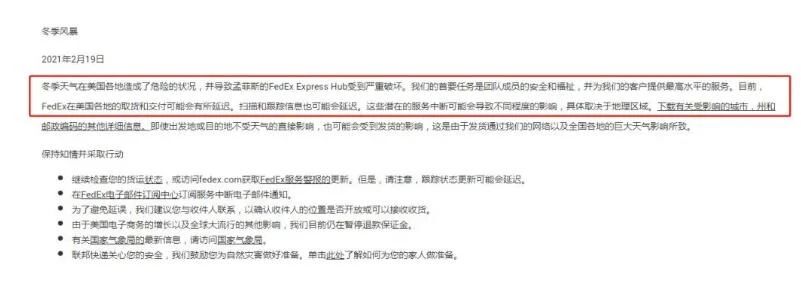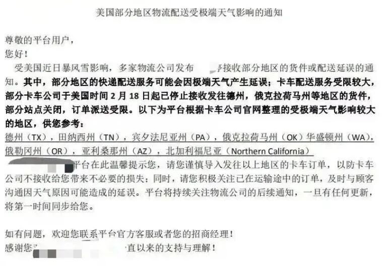 卡車配送服務(wù)受限較大,部分卡車公司于美國時間2月18日起已臨時停止接收發(fā)往德州,俄克拉荷馬州等地區(qū)的貨件,部分站點關(guān)閉,訂單派送受限。